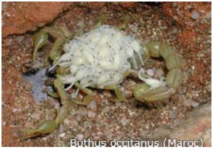 Fig. 10 : le scorpion femelle porte ses petits sur son dos