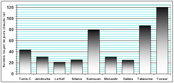 Ainsi, ben boubaker 2010, a montré que les régions du sud, notamment celles de Tozeur et Tataouine connaissent la fréquence annuelle la plus élevée de jours de forte chaleur. Elle est de 121 jours /an à Tozeur et 87 jours /an à Tataouine.