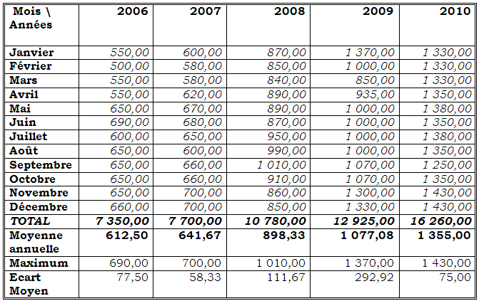 Il ressort de ce tableau que les prix moyens annuels d’un litre d’essence vendu à la pompe en ville de Butembo ont respectivement été de CDF 612,50 ; CDF 641,67 ; CDF 898,33 ; CDF 1077,08 et CDF 1355,00 ; considérant la période allant de 2006 à 2010. Nous constatons que durant cette période le prix moyen mensuel le moins élevé a été de CDF 500,00 le litre en début de l’année de 2006 ; tandis que le plus élevé est de CDF 1 430,00 qui intervint en fin d’année 2010.