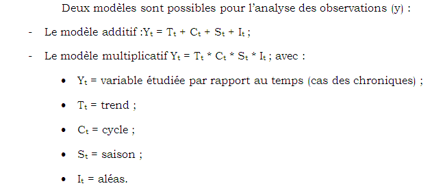 Pour le choix du modèle, on compare pour chaque année, l’écart maximum entre les observations d’une année et leur moyenne annuelle. S’il existe une relation de proportionnalité entre les sommes ou valeurs d’étude, le modèle multiplicatif s’impose.