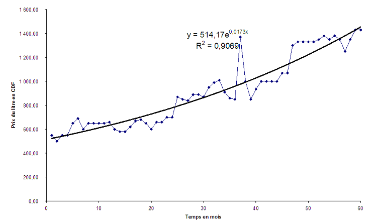 Au vu de ce graphique, nous constatons que le prix d’un litre d’essence vendu à la pompe en ville de Butembo a évolué en dents de scie. Il y a intermittence dispersée entre augmentations et diminutions. Les prix ont pris une allure généralement croissante au fil du temps d’une manière exponentielle comme le montre l’équation de la tendance