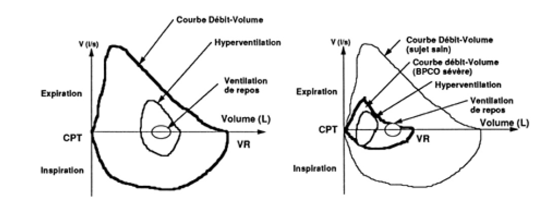 Figure 1. Comparaison de courbes débits/volumes entre un sujet sain et un sujet BPCO sévère..