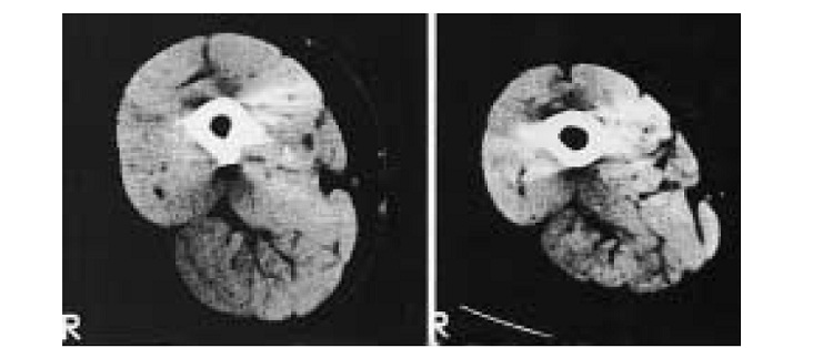 Figure.2 : Tomographie assistée par ordinateur d’un sujet sain (à gauche) et d’un sujet atteint de BPCO (à droite) appartenant au même groupe d’âge. [20]