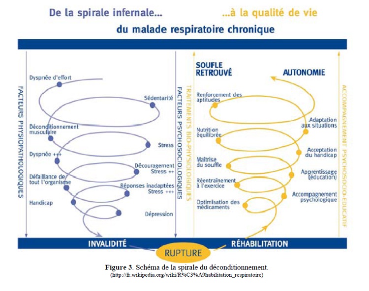 Selon ces différents aspects, les auteurs sont unanimes sur le fait que la BPCO majore la sédentarité, et que les sujets atteints de BPCO possèdent un niveau d’activité physique largement diminué avec une peur de la dyspnée d’effort [14]. De ce fait, ces sujets entrent dans une spirale de déconditionnement [1] passant par différentes étapes, augmentant peu à peu la dyspnée. La réhabilitation respiratoire est présente afin de briser cette spirale du déconditionnement [6] et permettre au patient de retrouver une qualité de vie suffisante et stable.