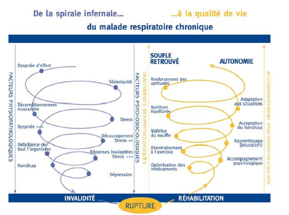 Selon ces différents aspects, les auteurs sont unanimes sur le fait que la BPCO majore la sédentarité, et que les sujets atteints de BPCO possèdent un niveau d’activité physique largement diminué avec une peur de la dyspnée d’effort [14]. De ce fait, ces sujets entrent dans une spirale de déconditionnement [1] passant par différentes étapes, augmentant peu à peu la dyspnée. La réhabilitation respiratoire est présente afin de briser cette spirale du déconditionnement [6] et permettre au patient de retrouver une qualité de vie suffisante et stable.