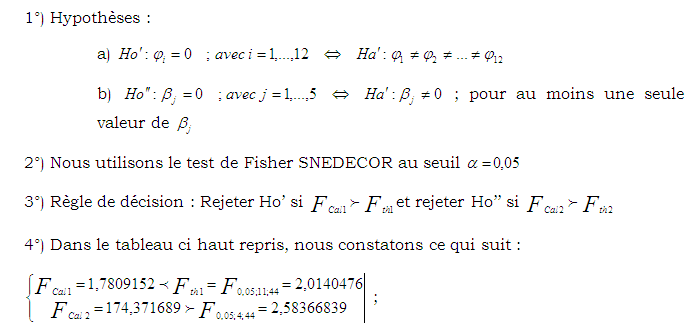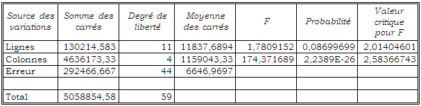 Ce test nous permet de vérifier si la composante saisonnière existe pour expliquer la variation dans le temps. Ce test est basé sur l’analyse de la variance à deux facteurs. Nous y allons du tableau ci-après :