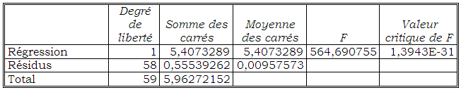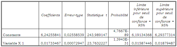 Ce test nous permet de vérifier si la pente et le terme indépendant sont significatifs. Les résultats sont regroupés dans le tableau suivant :