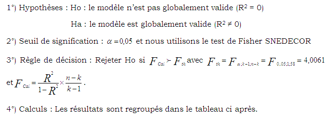 Ce test nous permet de vérifier si l’explication du prix dans le temps est valide. En d’autre terme, il s’agit de tester si le coefficient de détermination R2 est significativement non nul. Nous partons des étapes ci-après :