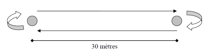 Ce sont dans les années 1970 qu’apparaissent véritablement les premiers tests de marche à durée imposée. Afin d’obtenir une estimation supplémentaire de la tolérance à l’exercice, le test de Cooper est adapté à une population souffrant de BPCO [28]. Au fil des années, ce test de 12 minutes est raccourci à 6 minutes [29]. Le test de marche de 6 minutes est un test d’intensité sous maximale possédant, selon Enright [30] ou Troosters [31] des équations prédictives de distance chez le sujet sain en fonction de l’absence ou non d’encouragement lors du test. (ANNEXE 5). Pour le TM6, l’épreuve consiste à parcourir en marchant, la plus grande distance en 6 minutes. Ce test était réalisé dans un couloir où des chaises étaient placées à une distance de 30 mètres l’une de l’autre. Le patient devait alors réaliser le plus grand nombre d’aller-retour en 6 minutes.