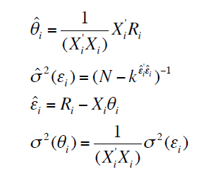 Pour ce faire, nous pouvons estimer l’ensemble des paramètres liés à chaque modèle à l’aide d’une représentation matricielle de la période N. A ce titre, nous pouvons consulter les études de John Y. Campbell, Andrew W. Lo et Craig MacKinlay, publiées en 1997(14). Deux composantes sont à calculer. Soit Ri, le vecteur composer des N taux de rentabilité et Xi :