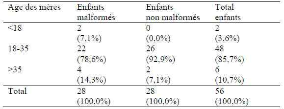 L’âge moyen chez les mères des enfants malformés est de 28,5 (DS=7,5253) contre 26,7