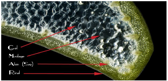 La feuille des aloès est divisée en deux fractions principales (figure 3) ; l’écorce vert externe (Rind) et le parenchyme sans couleur à l’intérieur. L’écorce est riche en dérivés de dihydroxyanthraquinones et leurs glycosides, tandis que le tissu de parenchyme ou la pulpe est riche en hydrates de carbone complexes, entre ces deux fraction se trouve un liquide de couleur jaune appelé : latex, suc ou la sève (Pillizoni et al., 2012).