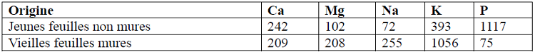 Le tableau suivant résume la teneur du gel des feuilles d’Aloe arborescens en quelques minéraux en fonction de leurs états de maturité.