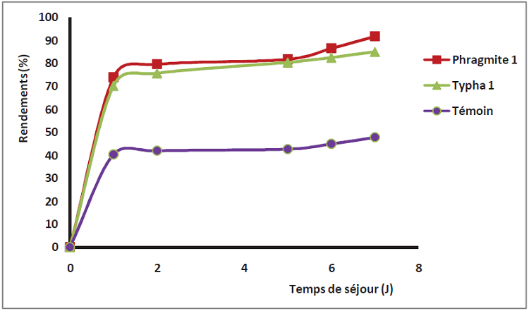 L’examen des courbes obtenues permet de noter que l’élimination du zinc en présence des plantes est en général supérieur à celle du témoin avec une prédominance nette de la plante phragmites australes par rapport au typha les meilleurs rendements obtenus après 7jours de contact sont de l’ordre de 91.70% et 85% respectivement pour les phragmites et typha, par contre on a observé une élimination moyennement faible pour le témoin qui est de 47.86% (Figure. II.02).Malgré l’absence des nutriments dans les eaux de robinet les plants ont prouvés leurs performances à éliminer le zinc.