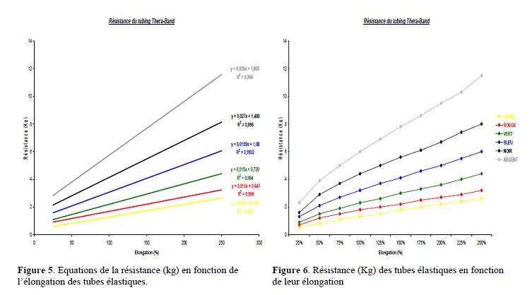D’après les figures 5 et 6, on constate que plus le tube élastique est étiré, plus sa résistance est augmentée. Son élongation nécessite donc plus de force. Le désavantage de la résistance élastique est l’augmentation progressive de la force en fonction de l’étirement du tube. Afin de pouvoir individualiser au mieux les différents exercices, il est important de quantifier le travail musculaire fourni afin d’objectiver une éventuelle progression. La Thera-band® Academy (www.Thera-BandAcademy.com) tente par différents travaux de recherches, de rendre scientifique et objectivable le travail avec le matériel élastique.