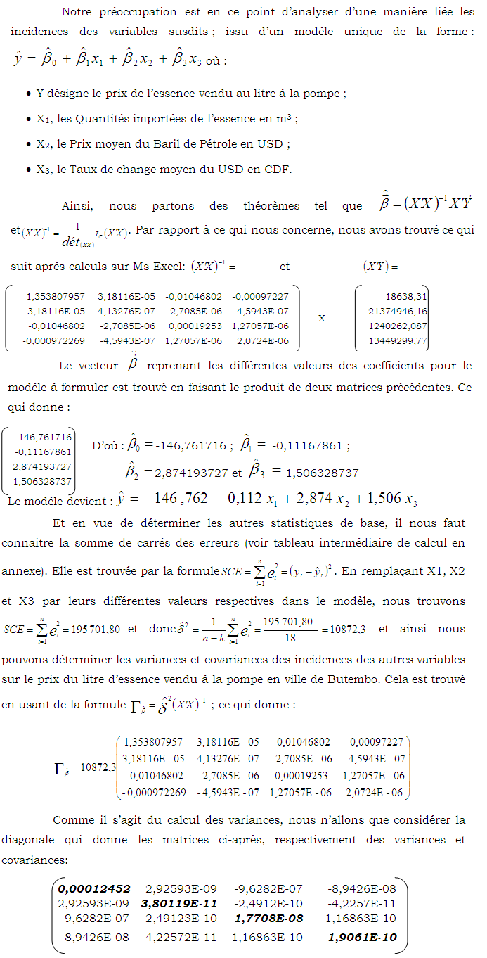 6°) Conclusion : Comme les valeurs calculées de T pour les trois premières variables sont inférieures à la valeur théorique au seuil de 5%, nous concluons que les variables quantités importées d’essence et prix du baril de pétrole exercent des influences moins significatives sur le prix du litre d’essence en ville de Butembo.