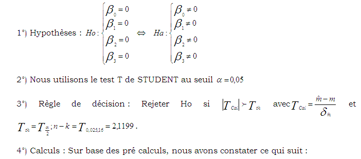 Par rapport au test des paramètres de régression, nous procédons par les étapes suivantes :