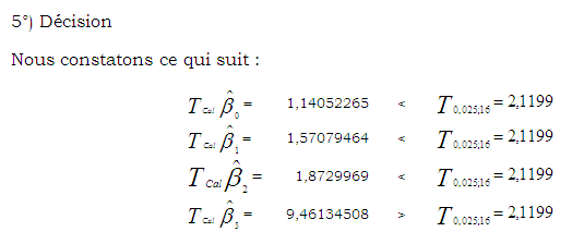 5°) Décision et Conclusion : Nous constatons que F cal= 36,3006455 est supérieur à Fth= 3,24. Nous concluons que le modèle est globalement valide ; d’où le coefficient de détermination est significativement non nul.