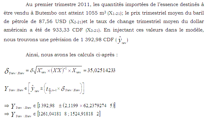 Nous sommes confian ts à 95% que le prix du litre d’essence au premier trimestre 2011 est compris entre 1261,04 CDF et 1524,92 CDF. Il est clair que le prix trimestriel moyen du litre d’essence vendu à la pompe a augmenté dans l’intervalle de la prévision par la tendance car il a été 1433,33 CDF, valeur appartenant bien à l’intervalle allant de 1261,04 CDF jusqu’à 1524,92 CDF.