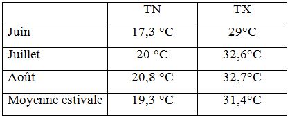 Les températures dites normale pendant la saison d’été pour la station de Tunis Carthage sont indiqué dans le tableau 6.
