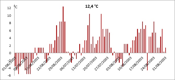 Figure 10 : Ecart à la normale de la température maximale (diurne) estivale en 2003 à la station de Tunis Carthage.