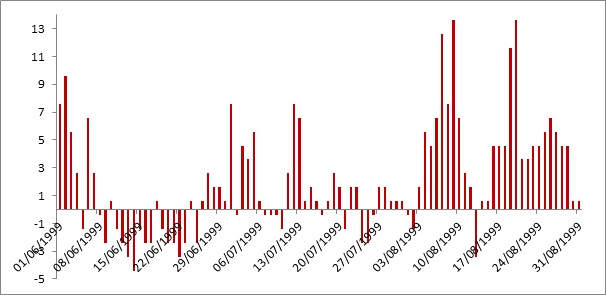 Figure 11: Ecart à la normale de la température maximale (diurne) estivale en 1999 à la station de Tunis Carthage