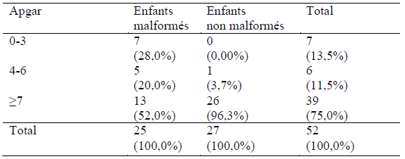 L’Apgar moyen des enfants malformés était de 5,9200 (DS=3,6959) contre 9,2593