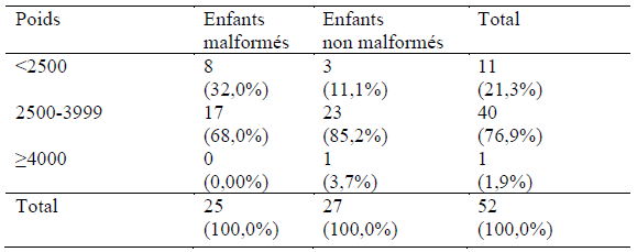 Le poids moyen du nouveau-né malformé était de 2714,2857gr (DS=765,4407) contre