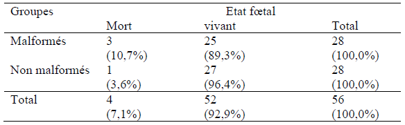 L’on enregistre 3 cas de mortinaissances parmi les nés malformés (10,7%) contre 1 cas dans