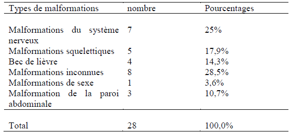 L’on enregistre 3 cas de mortinaissances parmi les nés malformés (10,7%) contre 1 cas dans