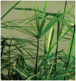Le papyrus (Cyperus papyrus)est une plante qui pousse notamment sur les rives du Nil et de son delta. Il est constitué d’une tige ligneuse de section triangulaire supportant des feuilles disposées en étoile à son sommet (Figure. II.04). Cette plante peut atteindre plusieurs mètres de haut. [2]