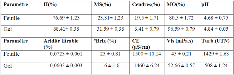 L’analyse statistique a montré que les résultats obtenus concernant les paramètres physicochimiques du gel et de la purée des feuilles sont significativement différents (P < 0,05).