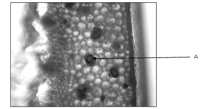 La photo ci-dessous illustre une coupe transversale de la feuille d’Aloe arborescens sous microscope optique après traitement par l’acide acétique et l’iodure de potassium.
