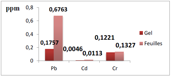 L’analyse statistique (test Student) révèle une différence significative entre les concentrations des métaux lourds du gel et de la feuille (P < 0,05).