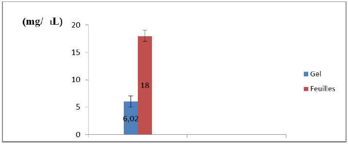 Selon la figure 07, on constate que la concentration de la vitamine C dans les feuilles est égale à 18 ± 0,92 mg/L, cette valeur est supérieure à celle du gel où la concentration en vitamine C est de 6,02 ± 0,54 mg/L. Donc la feuille est plus riche en vitamine C que le gel.