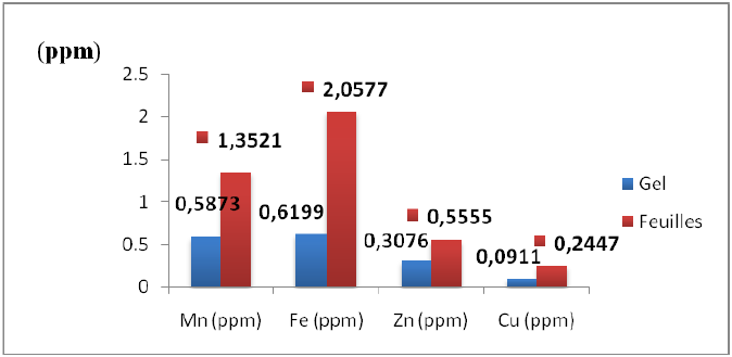 L’analyse statistique (test Student) révèle une différence significative entre les concentrations des éléments minéraux (oligoéléments) du gel et de la feuille (P < 0,05).