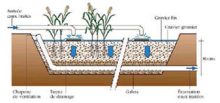 Pour cette raison, le filtre à écoulement vertical est alimenté de façon intermittente, il n’est donc pas saturé d’eau. Les eaux usées sont distribuées sur la surface du lit et percolent à travers le milieu et les racines des plantes jusqu’à un réseau de drainage situé dans une couche drainante au fond du lit. De surcroît, le marais est divisé en 2 ou 3 bassins, il est donc en fonctionnement 1semaine sur 2 ou sur 3, permettant ainsi une bonne dégradation de la matière organique. Le filtre à écoulement vertical remplace la fosse septique ou toutes eaux. Le milieu n’étant pas réducteur, il n’y a pas d’odeurs. La couche superficielle de compost générée sera à enlever tous les 10 -15 ans.