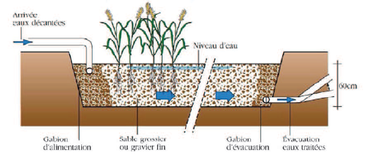 Le filtre à écoulement horizontal sous la surface est constitué de bassins remplis d’un milieu poreux dans lequel sont placées des plantes émergentes. Les eaux usées s’écoulent horizontalement sous la surface à travers le milieu et les racines des plantes. Les végétaux ont, ici, un rôle mécanique comme pour les marais verticaux mais avec un rôle de fixation et d’épuration des micros polluants en plus. Le milieu créé est favorable au développement de micro-organismes aéro-anaérobiose. Le milieu n’est donc pas totalement anaérobique ce qui évite les dégagements d’odeurs. Ce type de marais va agir sur l’azote par dénitrification. Pour les autres éléments, il fonctionne par accumulation.