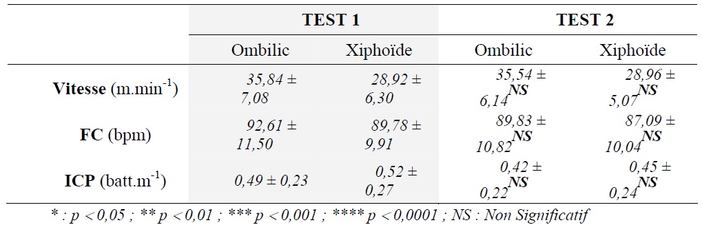 Selon l’analyse statistique du test de t de Student pour échantillons appariés, il n’existe aucune différence significative entre les paramètres de vitesse, de FC et d’ICP pour le test et le re-test.