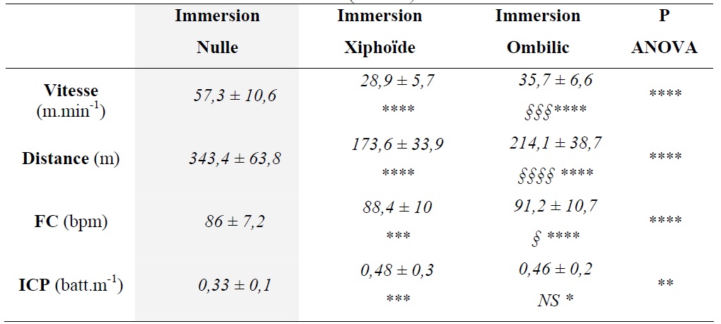 Tableau 7. Effet de l’immersion sur les valeurs de vitesse, distance, FC et d’ICP selon les trois modalités d’immersion. (M ± SDp)