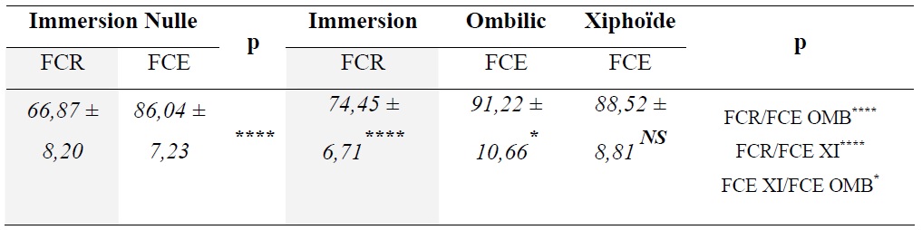 Ce tableau présente une différence significative entre les valeurs de FCR et de FCE au sec, et en immersion, ce qui est tout à fait normal car il y a une activité physique lors des tests de marche. La FCR en immersion est significativement supérieure (p < 0,0001) à celle au sec. La FCE moyenne en immersion à l’ombilic est supérieure à la FCE au sec (p < 0,05) et il n’y a pas de différence significative entre les valeurs de FCE en immersion xiphoïde et les valeurs de FCE au sec. La FCE en immersion xiphoïde est inférieure significativement à la FCE en immersion à l’ombilic.