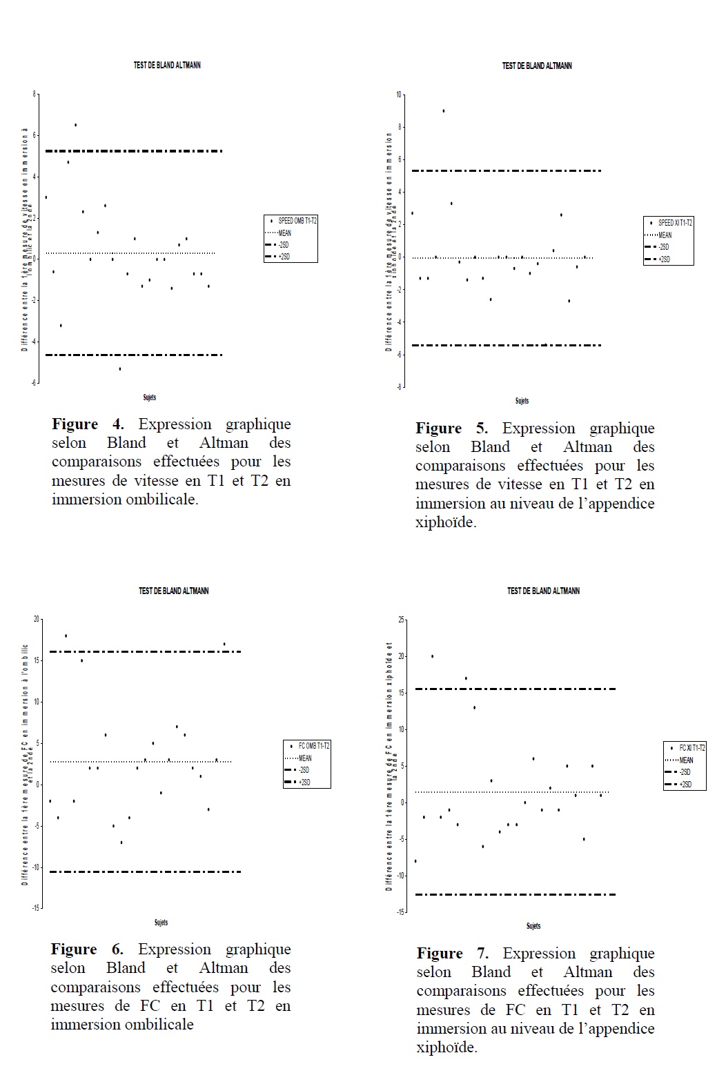 Il existe une différence significative (p < 0,0001) entre les valeurs de vitesse et de distance. Les valeurs de vitesse et de distance sont quasiment divisé par deux en immersion xiphoïde comparé à une immersion nulle. La FC lors du test de marche est plus importante lors du test en immersion, différence significative avec la FC prise lors du test de marche au sec. (p < 0,001). Cette différence est également retrouvée entre les valeurs d’ICP, le travail cardiaque est moins important lors du test de marche au sec.