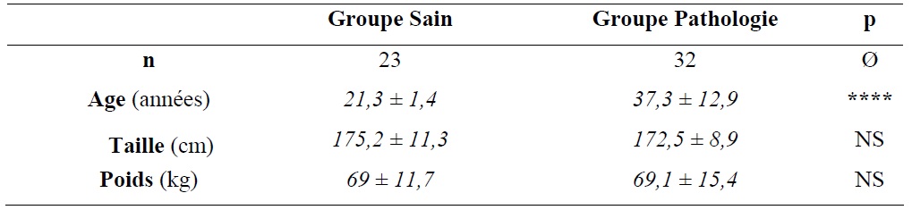 Au regard de ces différents résultats, je constate qu’il n’y a aucune différence significative entre le groupe sain et le groupe pathologie en terme de poids et de taille, une différence significative est relevée (p < 0,0001) concernant l’age des sujets. Le groupe sain est donc plus jeune que le groupe pathologie.