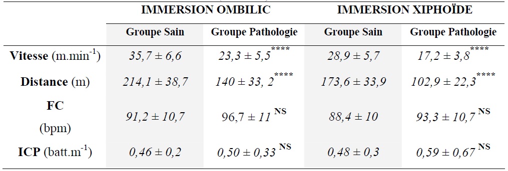 Cependant, je remarque une différence largement significative (p < 0,0001) pour les valeurs de vitesse et de distance. De ce fait la vitesse moyenne d’exécution des sujets sains en immersion à l’ombilic et en immersion au niveau de l’appendice xiphoïde est plus élevée que celle des sujets du groupe pathologie.