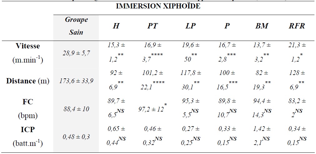 Tableau 14.2. Comparaison entre les performances du groupe sain et les sous groupes pathologies en immersion au niveau de l’appendice xiphoïde. (M ± SD p)