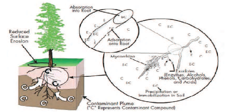 Utilisation des plantes pour réduire la biodisponibilité des polluants par les écoulements (latéraux ou en profondeur) ou immobiliser les composés polluants en les liants chimiquement par précipitation, stabilisation, absorption ou piégeage de ceux-ci par la plante (Figure. II.11).