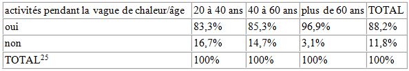 Le tableau 27 donne l’impression de la bonne adaptation avec la chaleur caniculaire, 91,5% pour ceux qui ont dépassé les 60 ans quittant leur domicile lors d’une vague de chaleur.