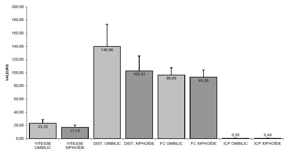 D’après les résultats précédents, il n’existe aucune différence significative entre les valeurs d’ICP en immersion au niveau de l’appendice xiphoïde et à l’ombilic. Le fait de marcher dans l’eau à ces deux profondeurs nécessite le même coût énergétique. Si je m’intéresse aux paramètres vitesse et distance, il existe une différence significative. (p < 0,0001). Les valeurs de vitesse et de distance sont plus élevées en immersion à l’ombilic qu’en immersion au niveau de l’appendice xiphoïde, respectivement 23,3 ± 5,5 m.min-1 et 140 ± 33,2 mètres contre 17,2 ± 3,8 m.min-1 et 102,9 ± 22,3 mètres.