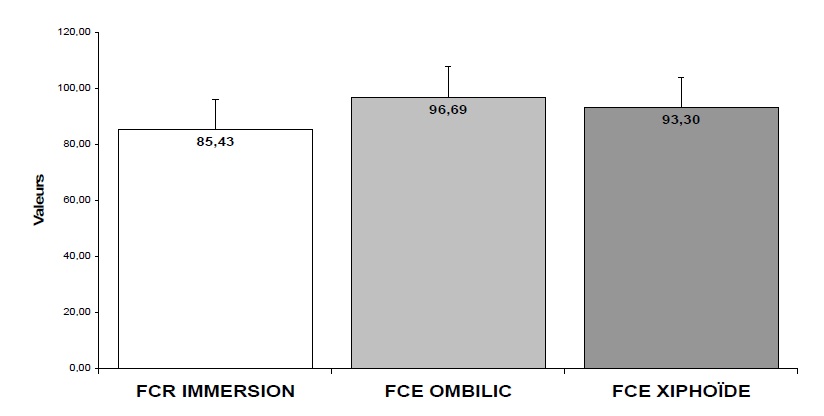 Le fait de marcher dans l’eau produit une augmentation du rythme cardiaque, c’est ce que nous indique le graphique de la figure 14. Cette augmentation est significative (p < 0,0001). Notons aussi une différence significative entre les valeurs de FCE en immersion au niveau de l’appendice xiphoïde et en immersion à l’ombilic. Lors du test de marche en immersion à l’ombilic, l’augmentation de la FC est de 12% par rapport à l’immersion au niveau de l’appendice xiphoïde qui est de 8%. La différence de profondeur n’influence que très peu l’augmentation de la FCE (4%).