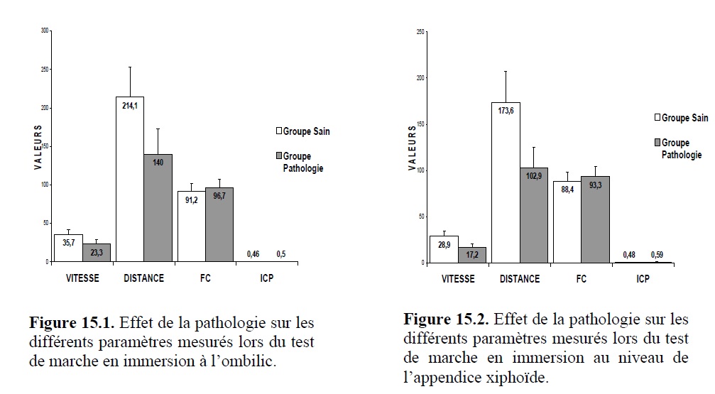 Les sujets ayant une pathologie possèdent plus de difficulté, si l’on s’attache au pourcentage de diminution de la distance par rapport aux sujets sains, lors d’une marche en immersion au niveau de l’appendice xiphoïde par rapport à une marche en immersion à l’ombilic. On remarque par ce résultat une perte de l’adaptation à un effort physique (perte musculaire, cardio-vasculaire…)